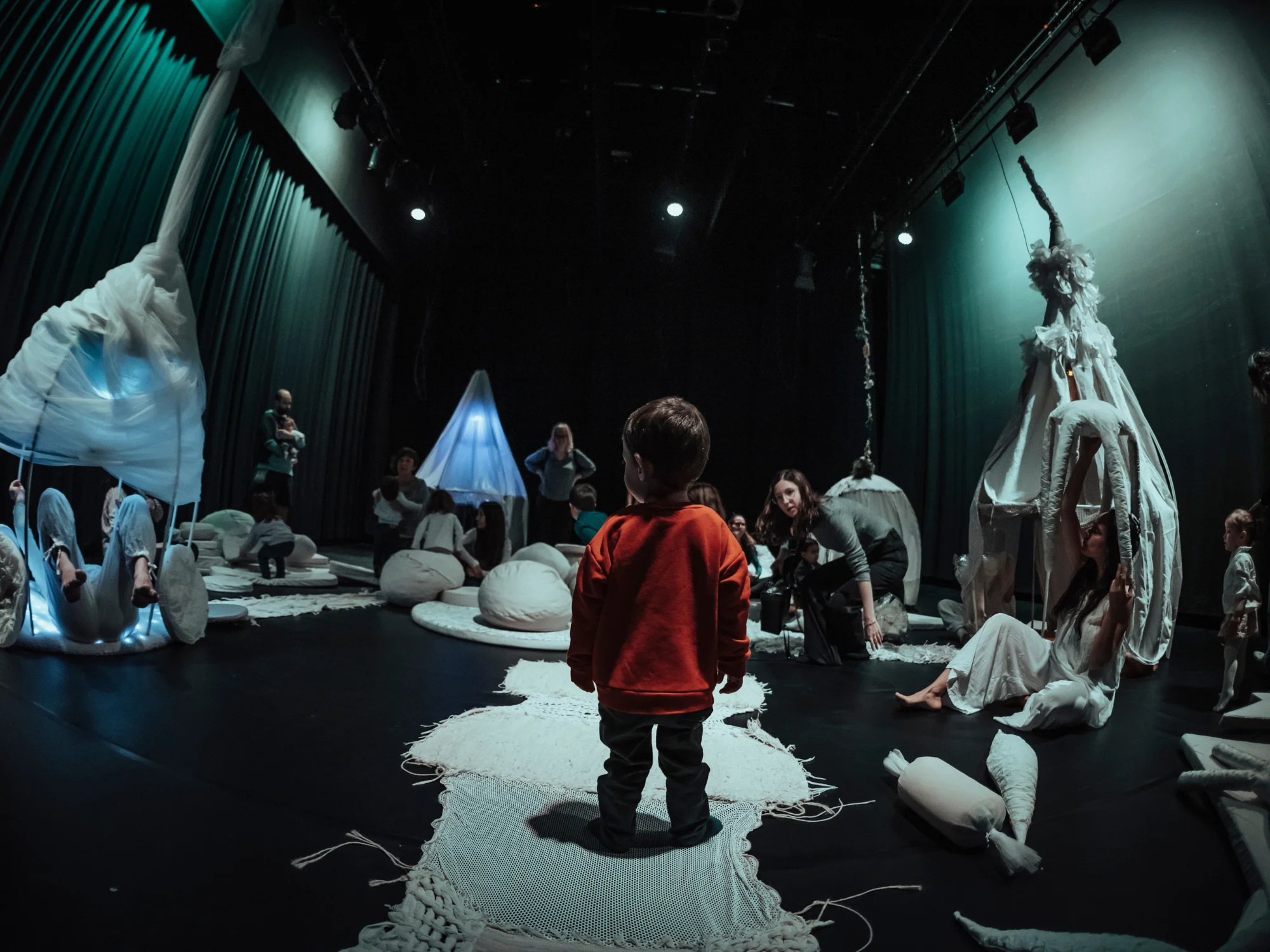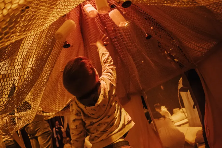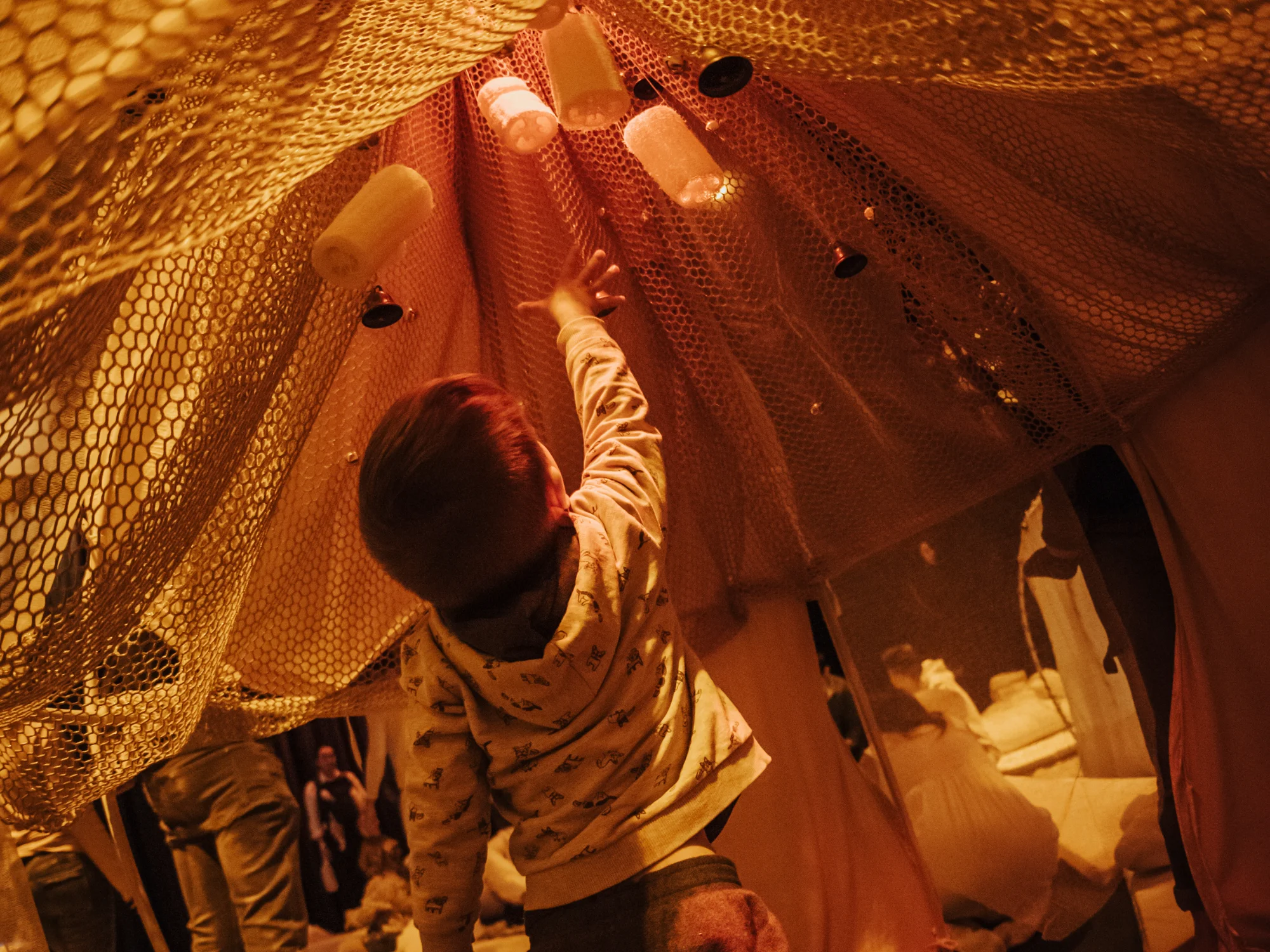 Una instalación para descubrir, imaginar y soñar. Un pequeño pueblo formado por cuevas de ropa y tejidos sorprendentes, que parecen construidos como lo hacen los animales en plena naturaleza, con materiales de diferentes texturas y olores. Un lugar donde esconderse y, desde dentro, observar el mundo. Caminos que nos llevan a casa de los demás, donde encontraremos diferentes colores, músicas y ruidos extraños. Cojines que hablan, que roncan, que ríen y cantan. Un espacio para explorar en familia, para relajarnos y disfrutar juntos de la comodidad del propio refugio.